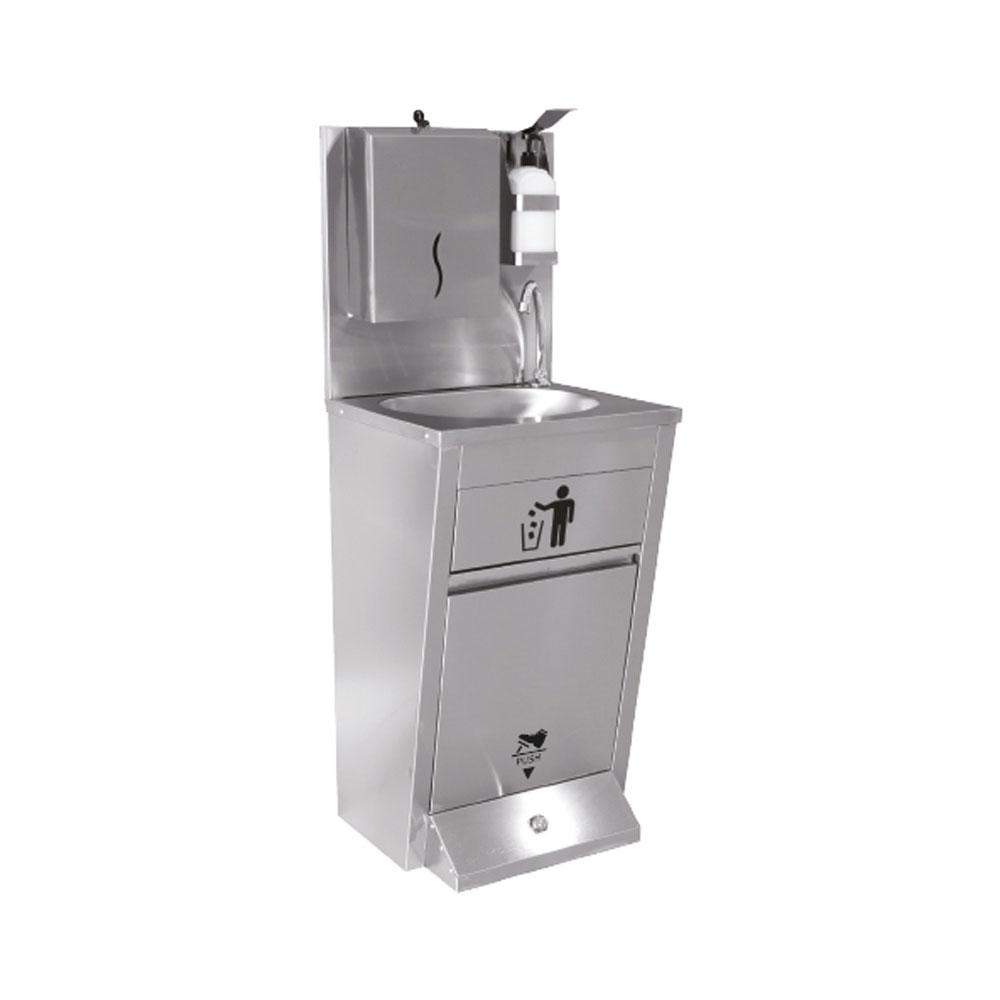 EMP.AYK.002 – Gehäuse aus rostfreiem Stahl – Zeitgemäßes Design – Schnelles und einfaches Aufstellen – Hygienischer, geschlossener Mülleimer – Fußbetätigtes Push-Pull-Wasserfluss-System – Z-förmiger Nippelhalter – Seifenspender mit Ellbogenbedienung