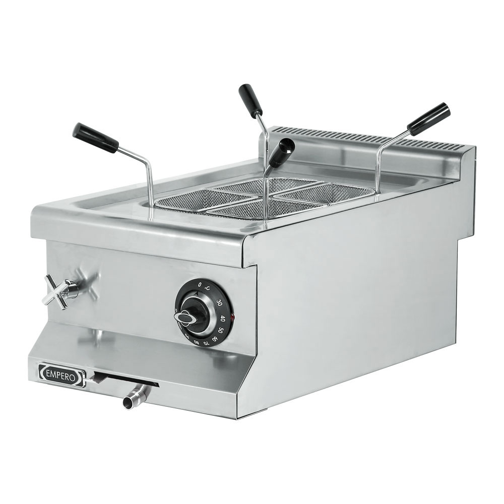 – Thermostatischer Regler. – Wassereinfüllhahn. – Ablassventil. – Überlauf-Ablaufsystem. – Dicke der oberen Platte 1,2 mm, Gehäuse 1 mm aus Edelstahl.